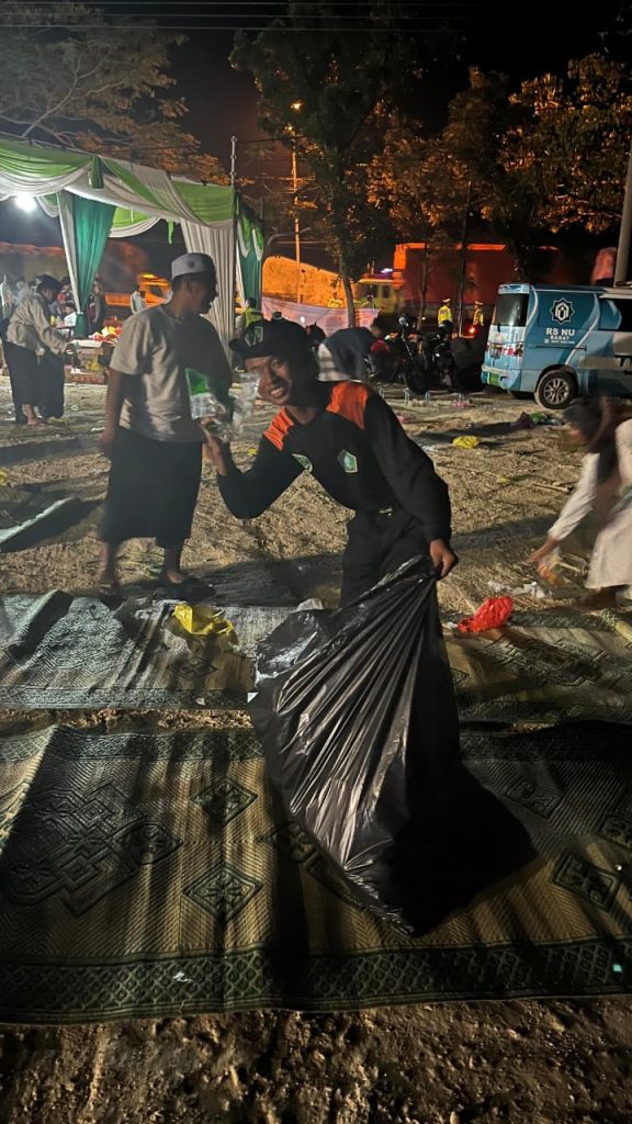 Usai acara inti, para kader dengan sigap menyusuri setiap sudut area kegiatan sambil membawa satu kantong sampah di tangan mereka. Sampah-sampah yang tercecer seperti bungkus makanan, botol plastik, hingga kertas langsung dibersihkan. Aksi kolektif ini membuat suasana NU Babat Centre kembali rapi dan bersih dalam waktu singkat, meski sebelumnya dipadati ribuan peserta.